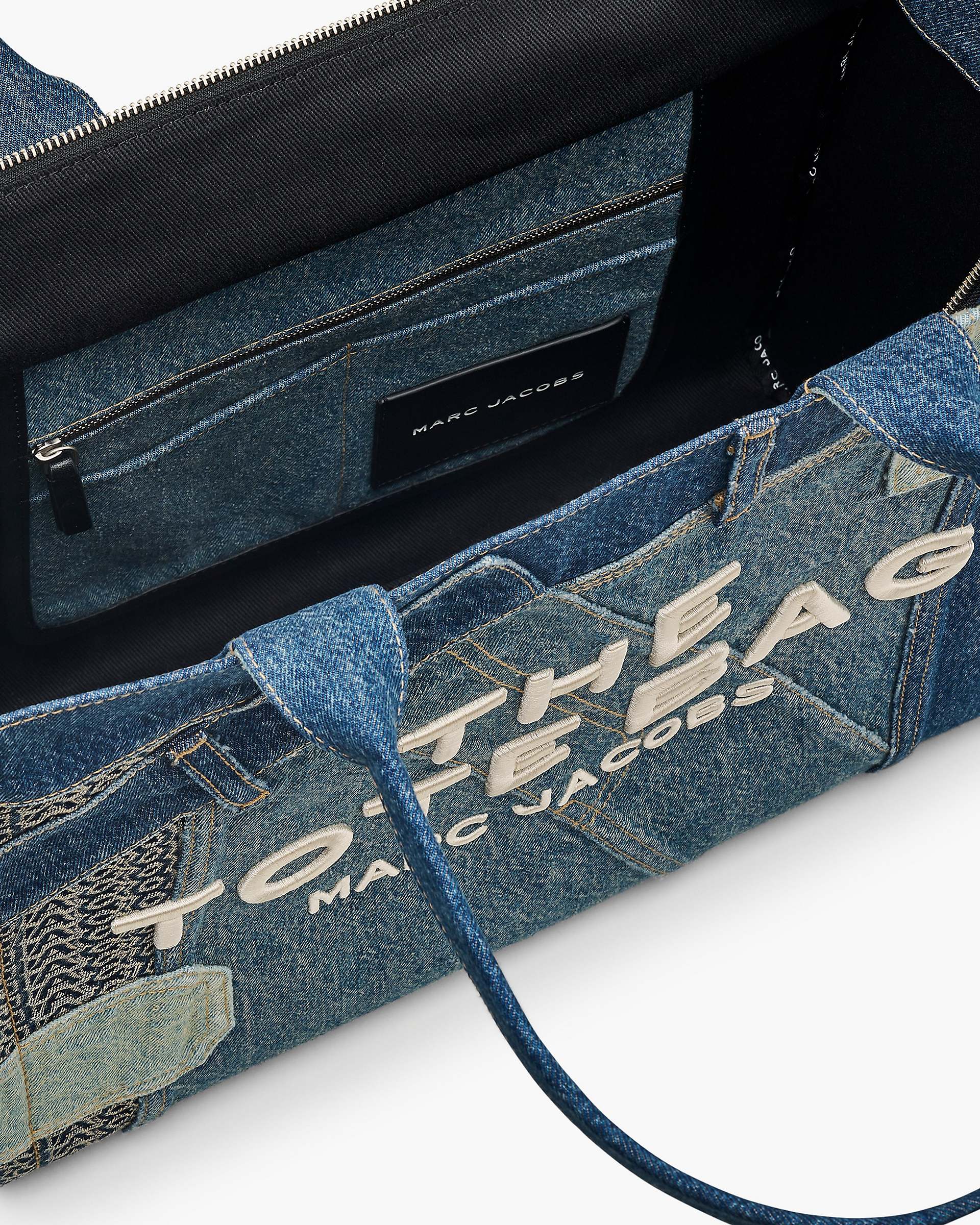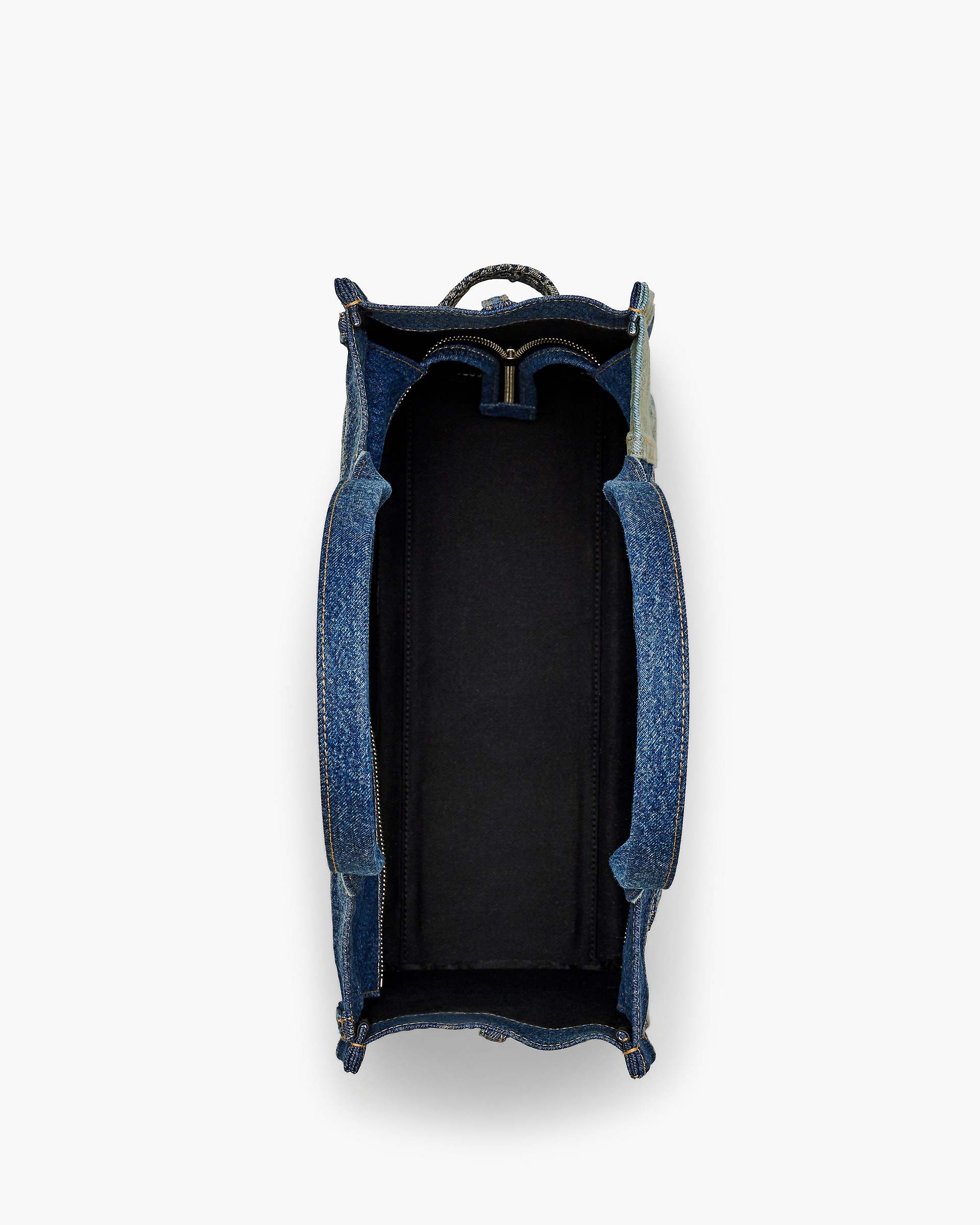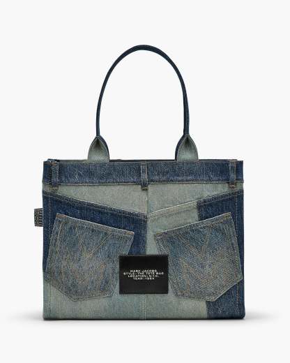 This version of our Large Tote is intricately designed with five different denim patches that are each uniquely treated for a deconstructed look. Shop Mathtrc Jacthtobs The Deconstructed Denim Large Tote Bag