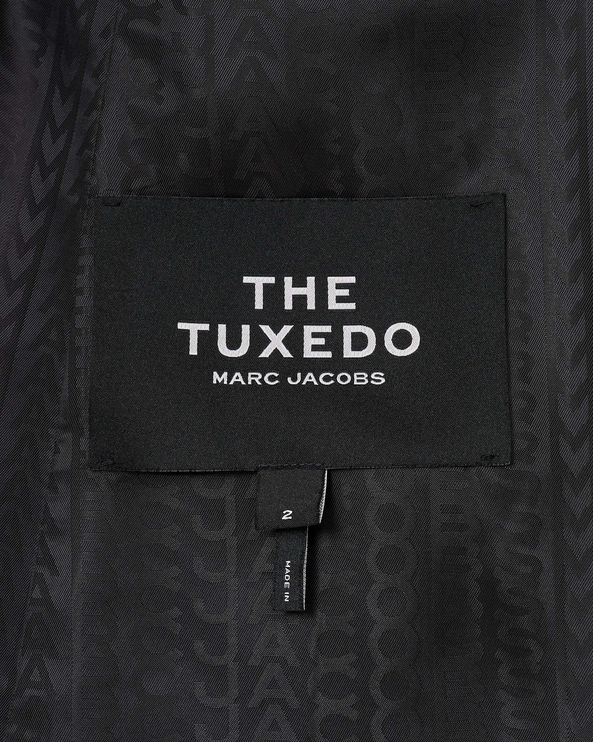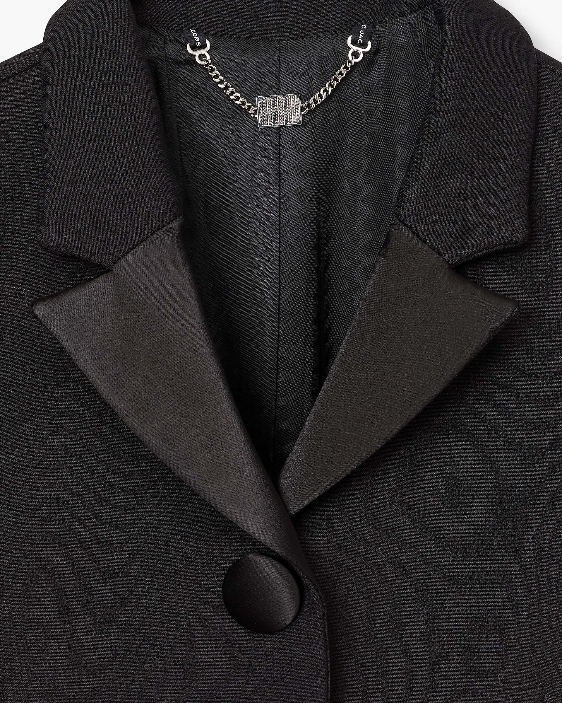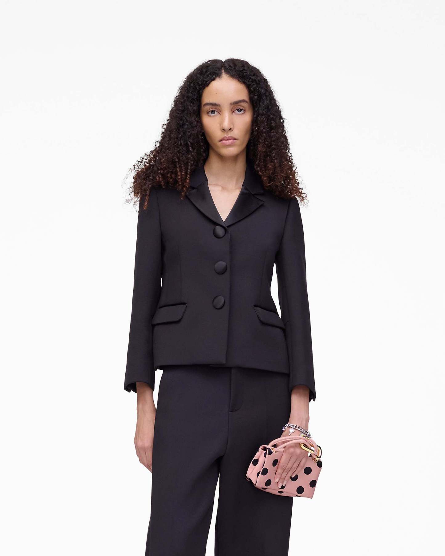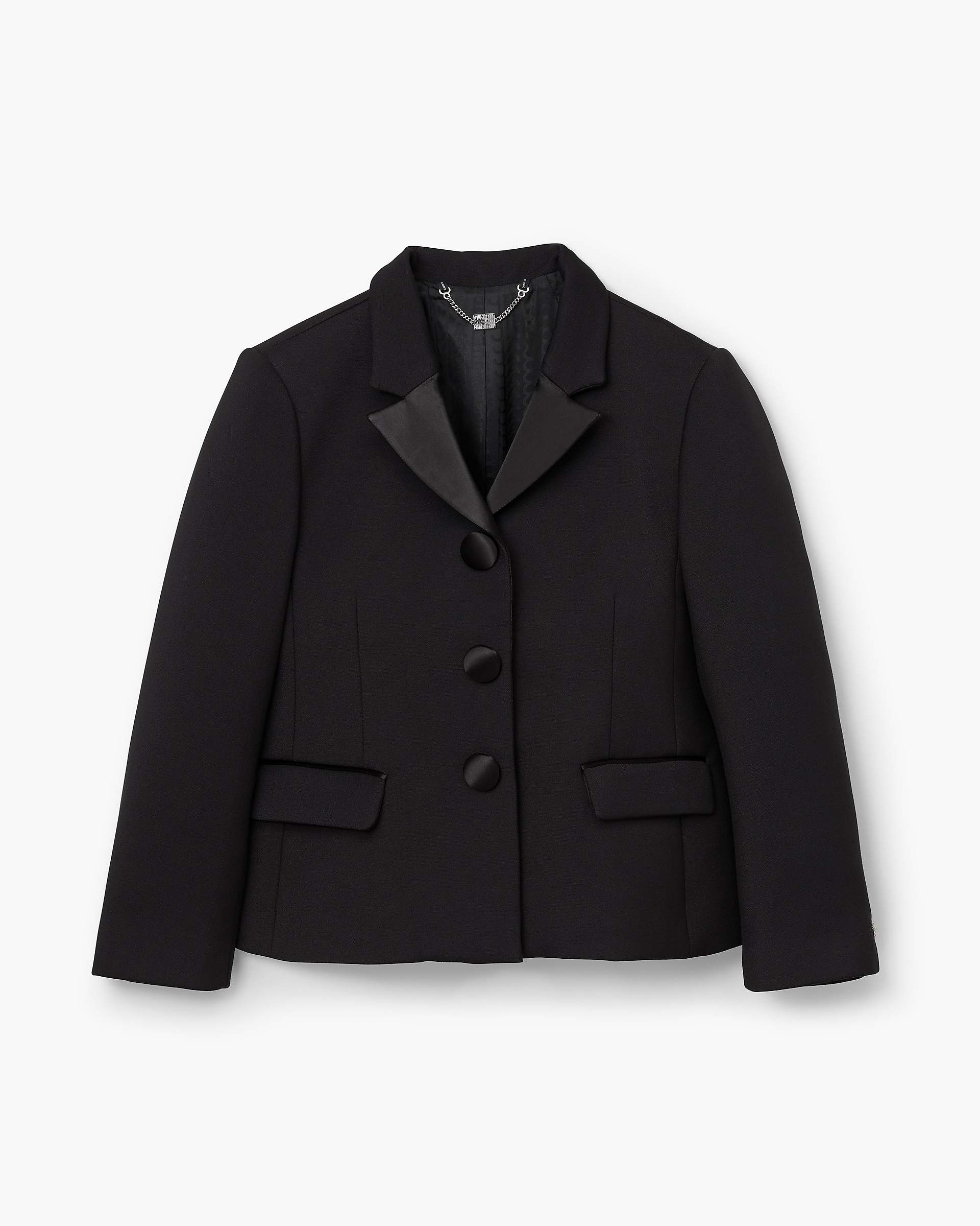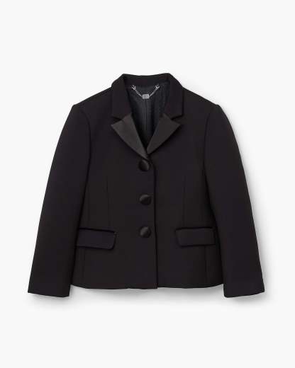 Tailored with a sleek feminine silhouette, this refined tuxedo jacket blends classic formalwear codes with modern softness. Crafted in spongy double weave suiting and accented with shiny satin details, it features bracelet-length sleeves, satin-covered snap closures and pavé daisy cuff buttons for a subtle touch of sparkle. Finished with two flap pockets at the waist. Shop Mathtrc Jacthtobs Tuxedo Suiting Blazer