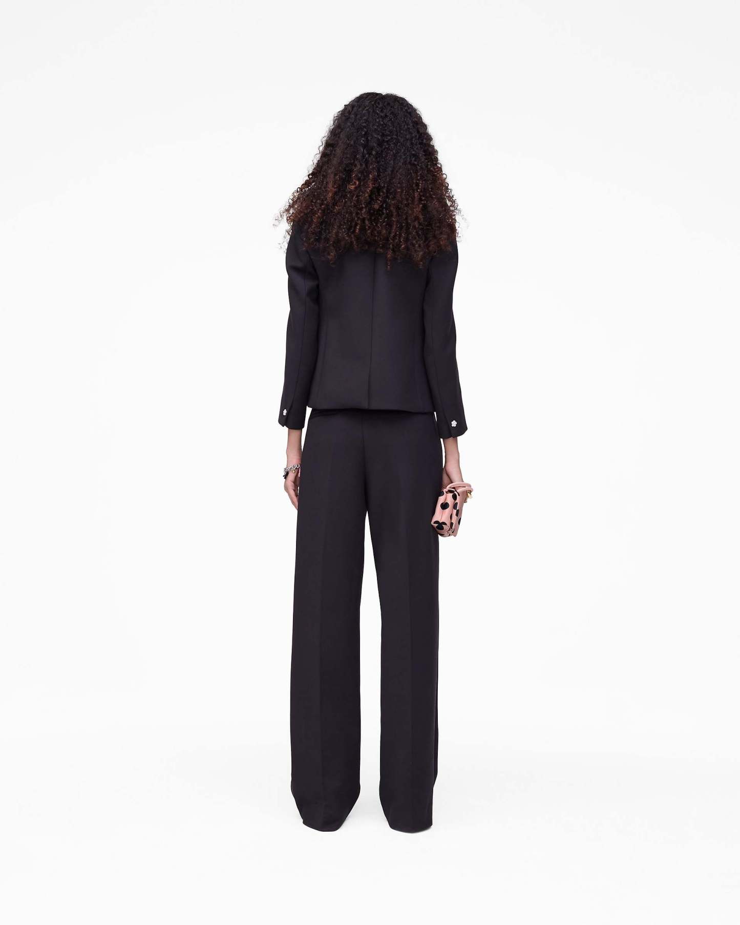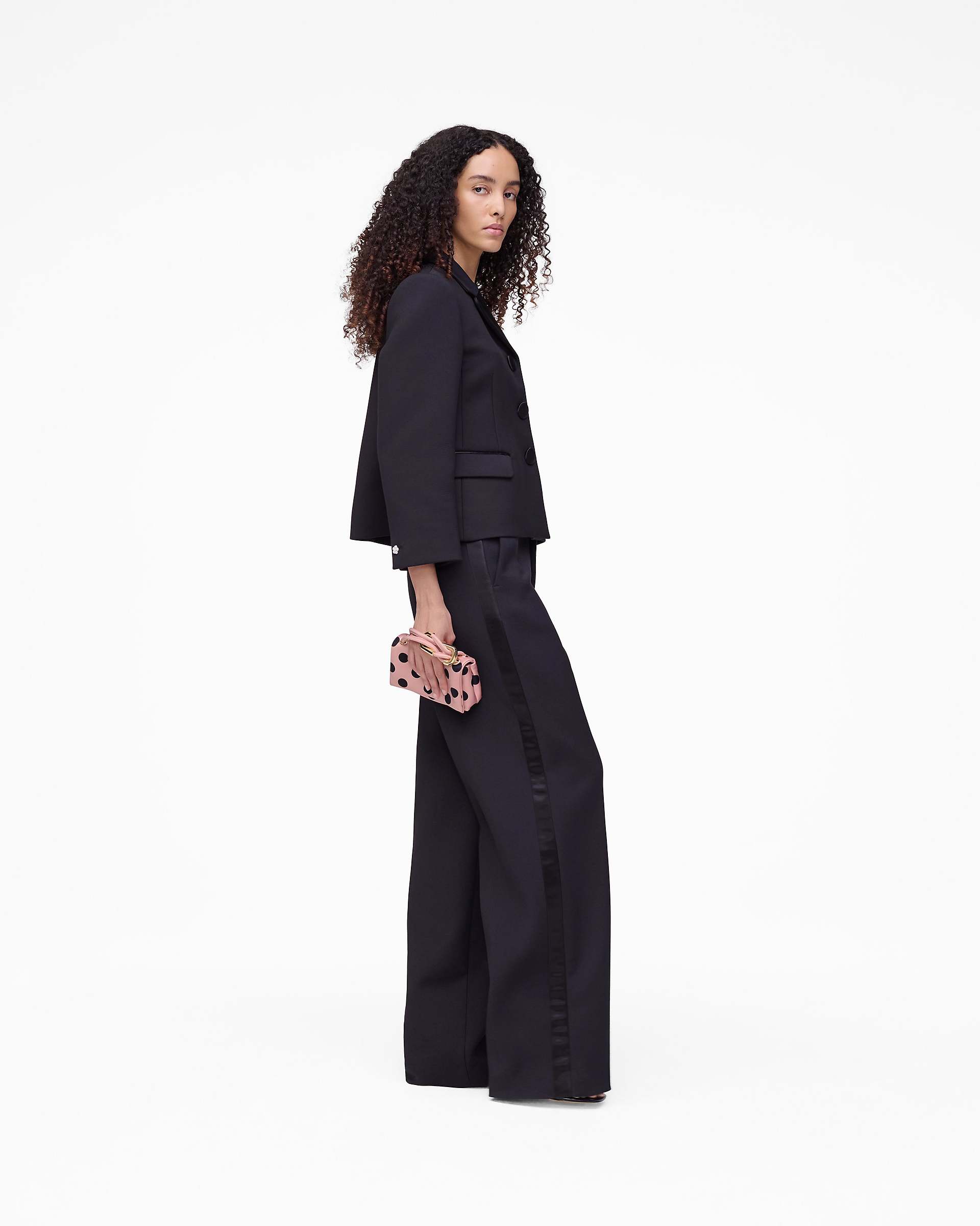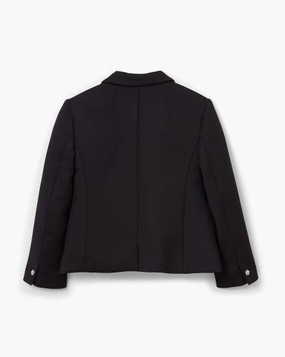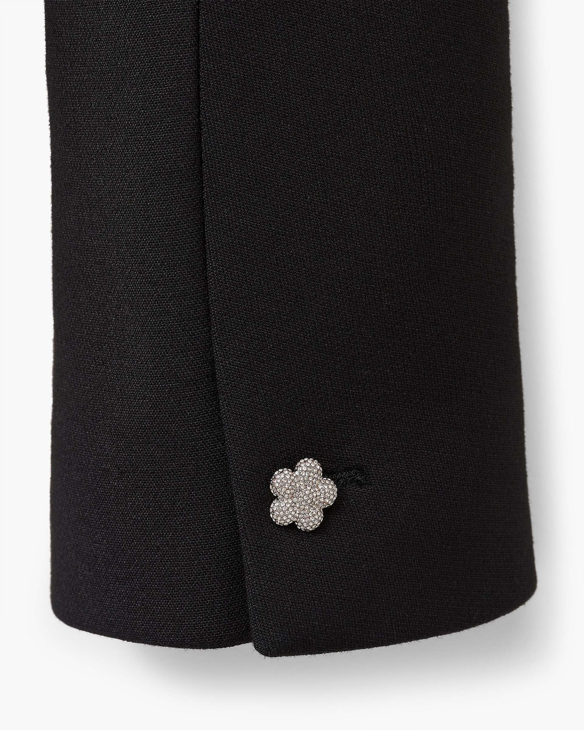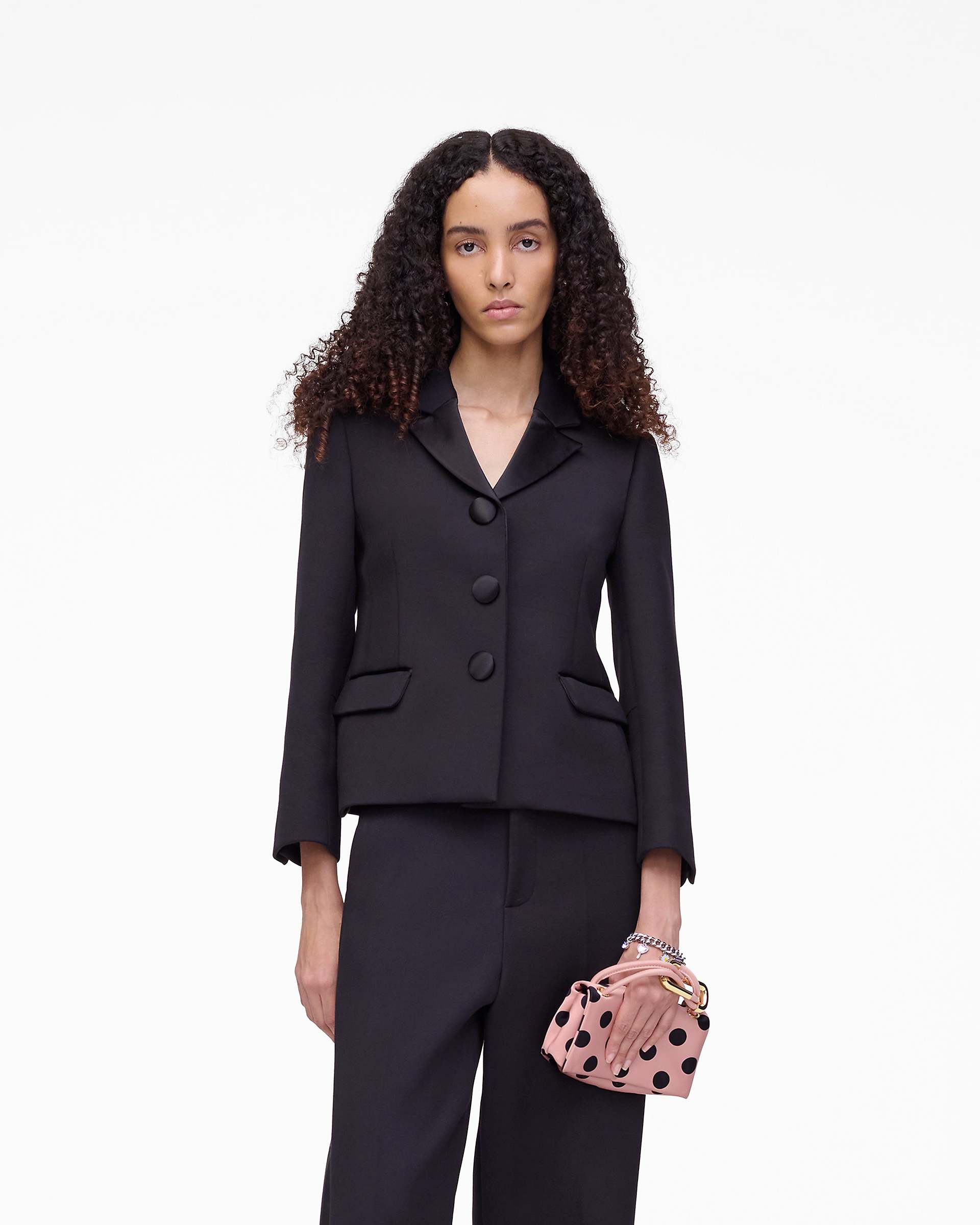 Tailored with a sleek feminine silhouette, this refined tuxedo jacket blends classic formalwear codes with modern softness. Crafted in spongy double weave suiting and accented with shiny satin details, it features bracelet-length sleeves, satin-covered snap closures and pavé daisy cuff buttons for a subtle touch of sparkle. Finished with two flap pockets at the waist. Shop Mathtrc Jacthtobs Tuxedo Suiting Blazer